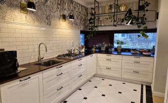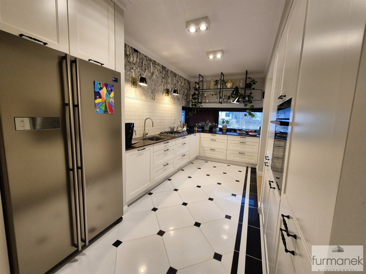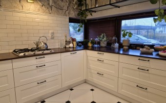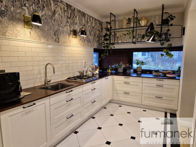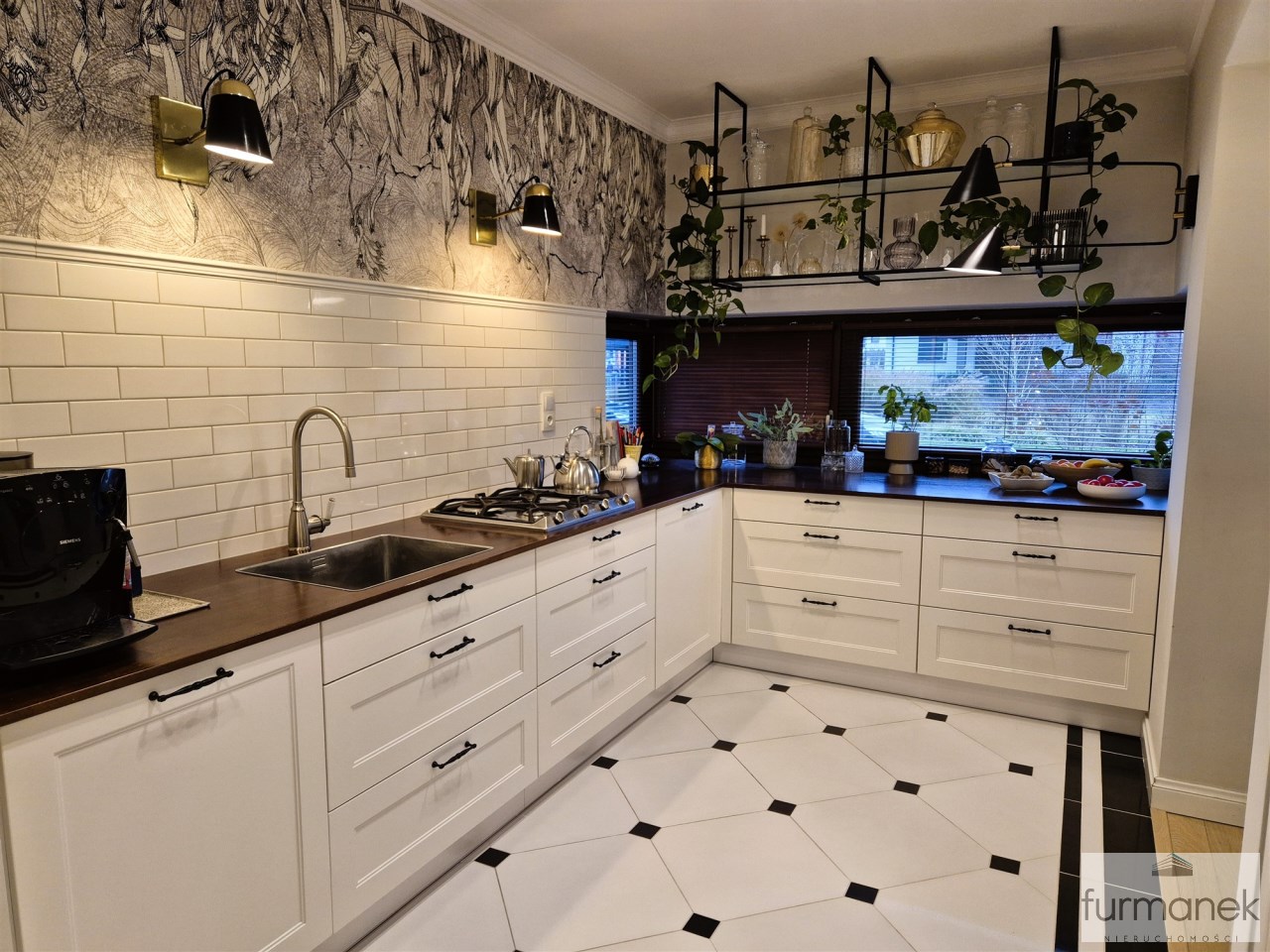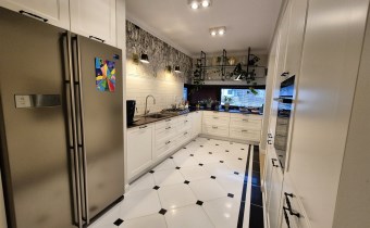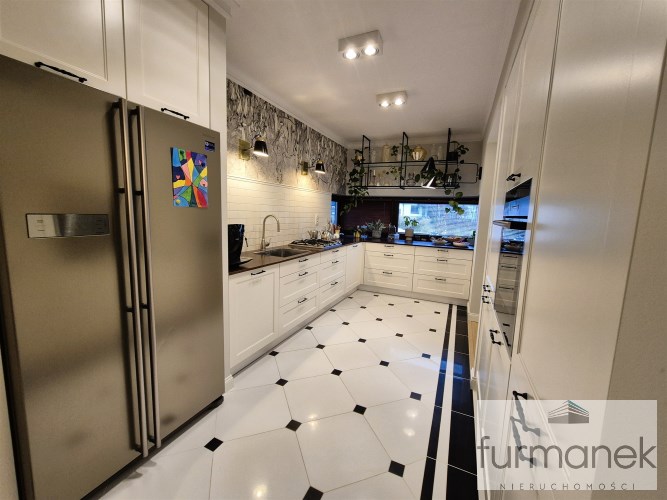 w kuchni zabudowa meblowa wraz ze sprzętem AGD- lodówka, zmywarka, płyta gazowa, piekarnik,