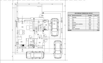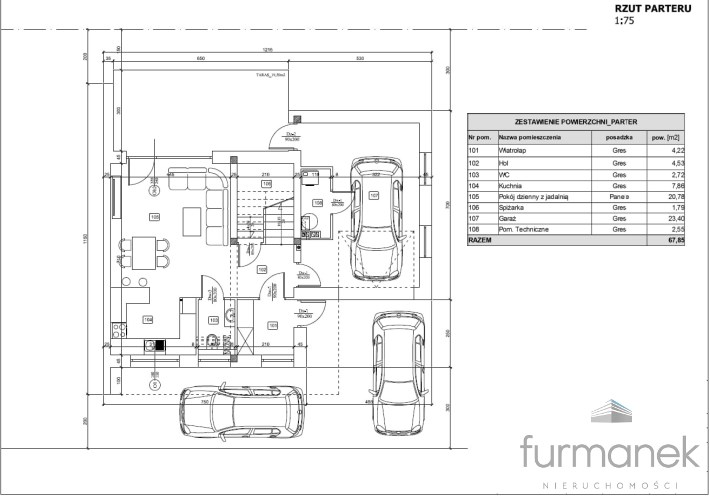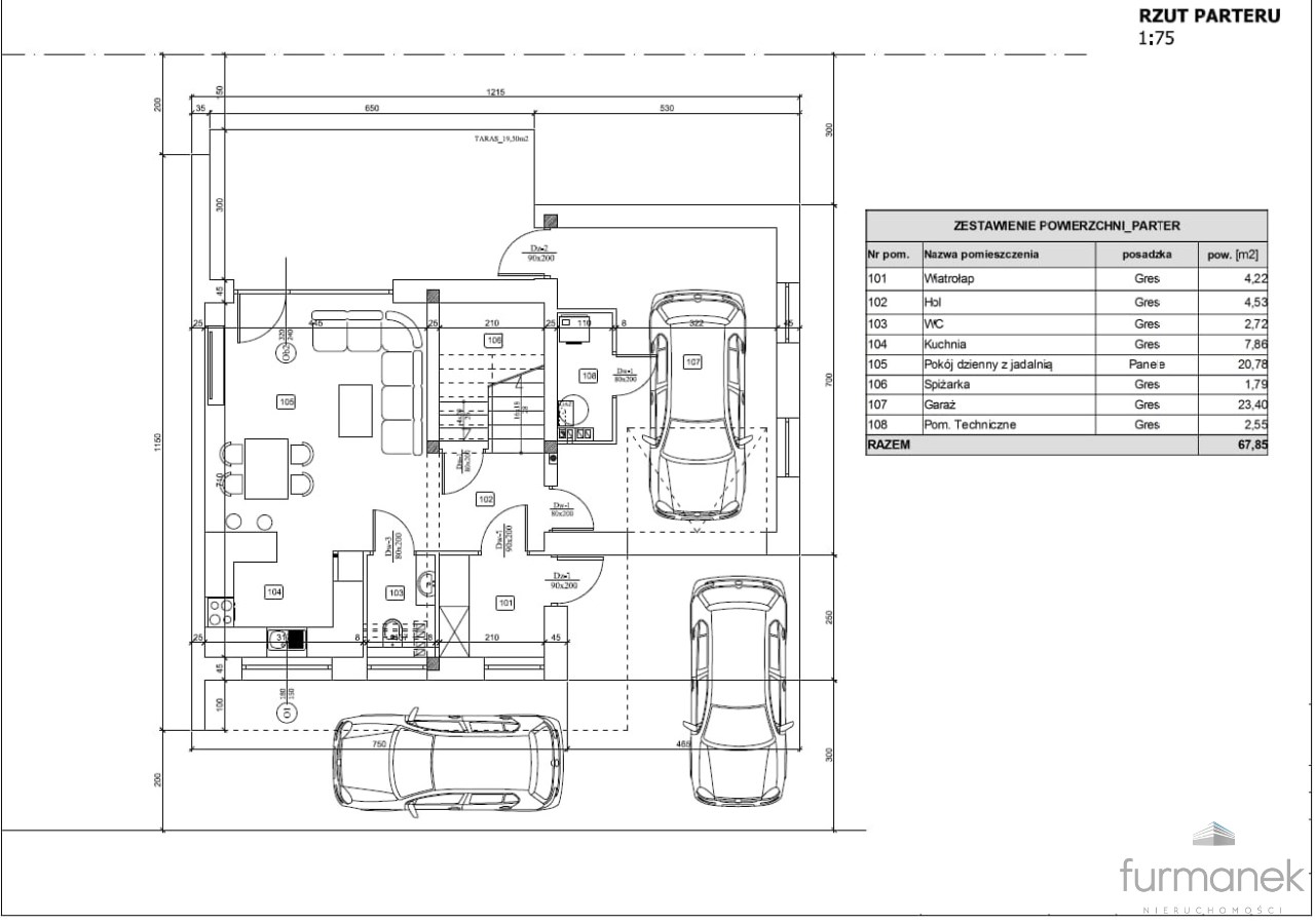 otwarta część dzienna na parterze to salon z aneksem kuchennym , szerokie przeszklenie w salonie prowadzi na taras, który sprawdzi się jako letnia strefa wypoczynku na świeżym powietrzu, z holu dostępna jest toaleta, a z wiatrołapu garaż z jednym miejscem postojowym (pow. 23,40 mkw),