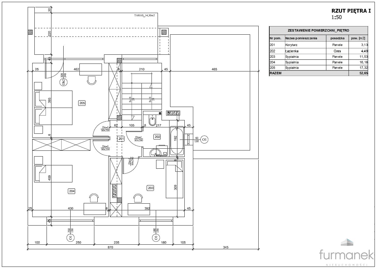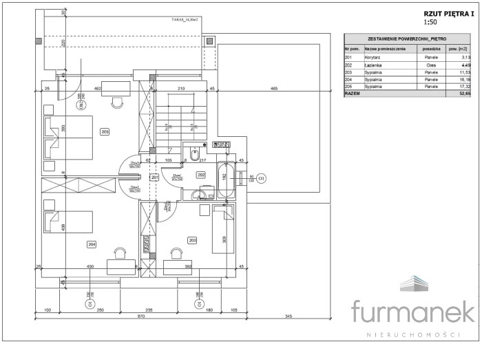 na piętrze zaplanowano trzy ustawne sypialnie i komfortową łazienkę. Wszystkie sypialnie zostały naturalnie doświetlone, posiadają też przestrzeń na pojemne szafy oraz biurka lub regały.