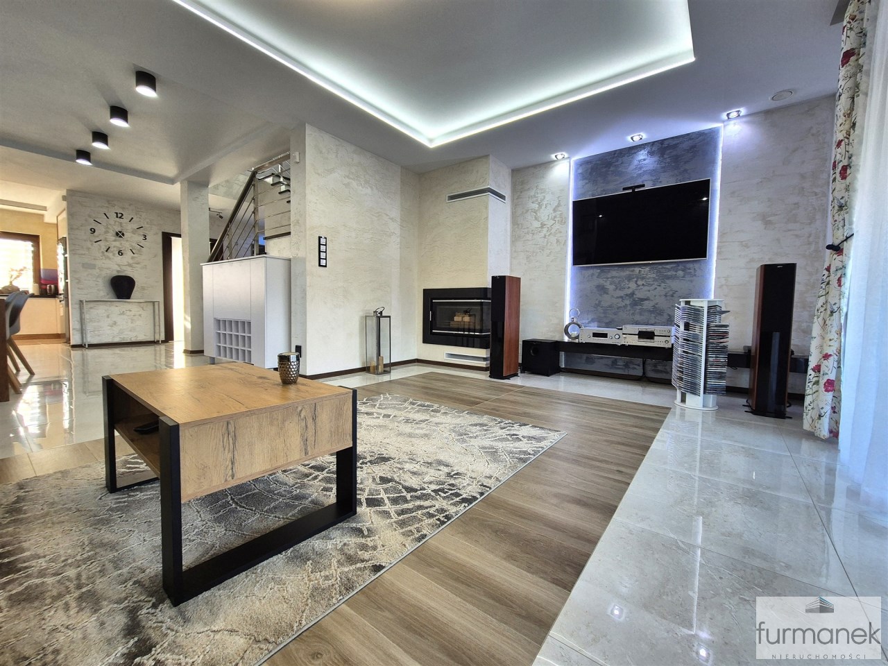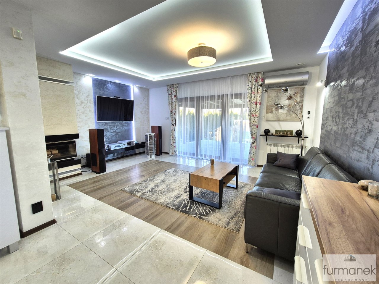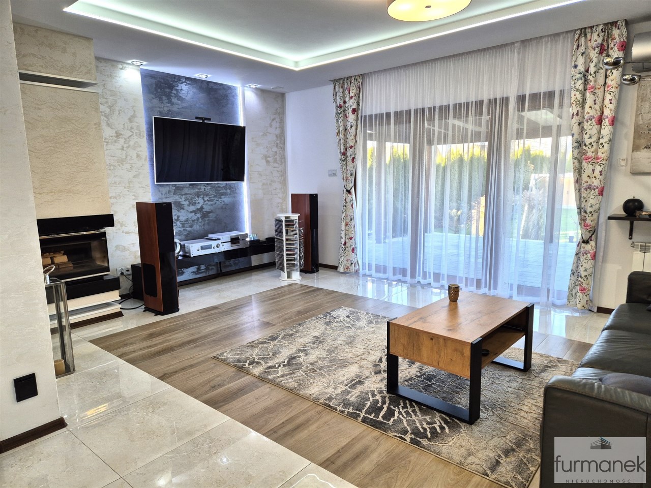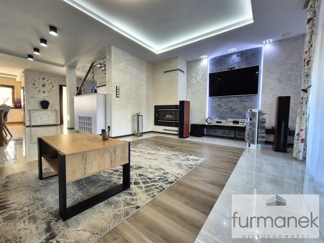 w salonie znajduje się kominek (bez płaszcza wodnego), który stanowi dodatkowe źródło ciepła oraz tworzy przytulny nastrój – idealny na zimowe wieczory i spotkania rodzinne,