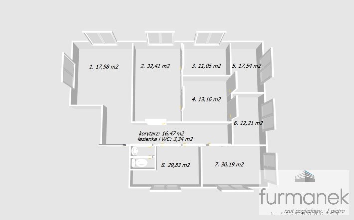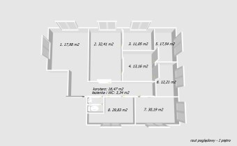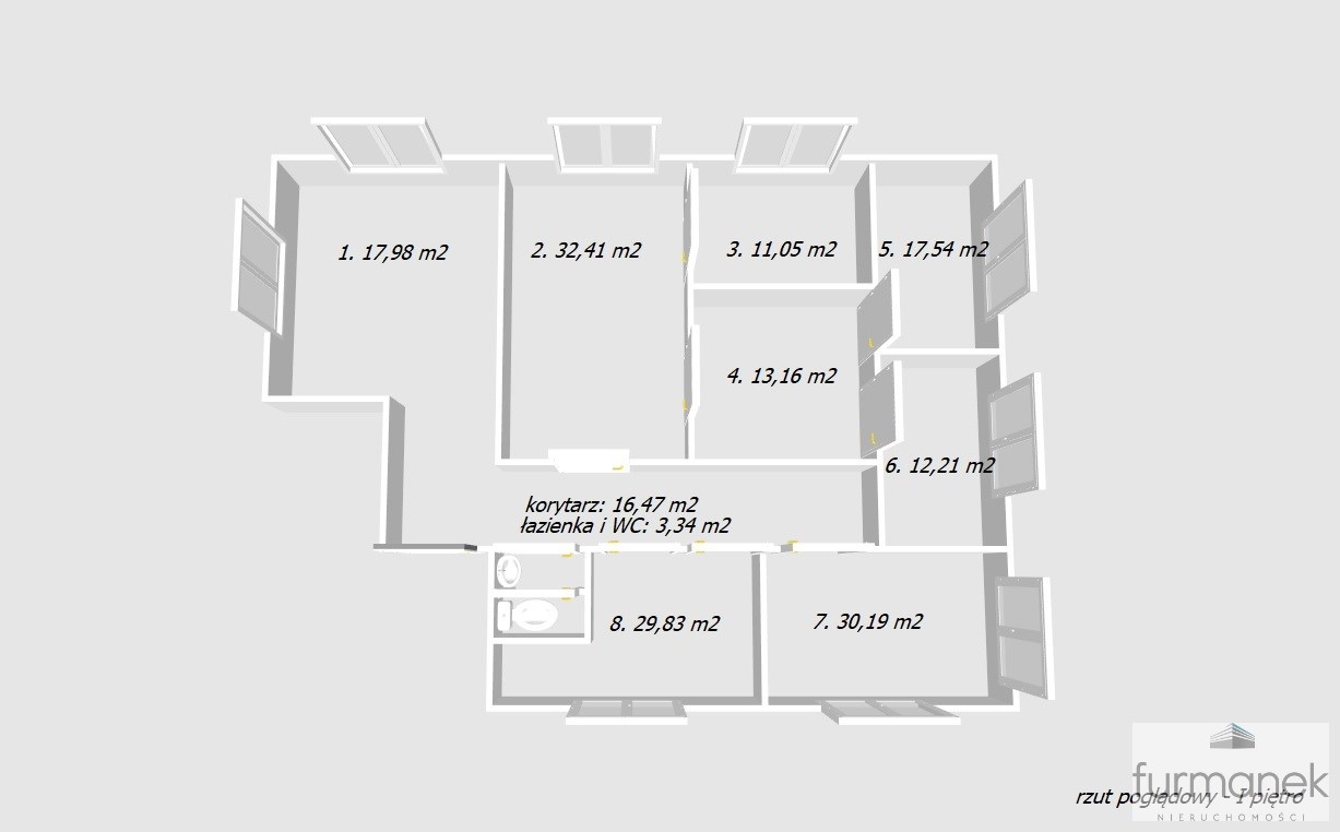 - rozkład pomieszczeń: korytarz (16,47m2), łazienka i WC (3,34 m2), lokal nr 1 (17,98 m2), lokal nr 2 (32,41 m2), lokal nr 3 (11,05 m2), lokal nr 4 (13,16 m2), lokal nr 5 (17,54 m2), lokal nr 6 (12,21 m2), lokal nr 7 (30,19 m2), lokal nr 8 (29,83 m2),