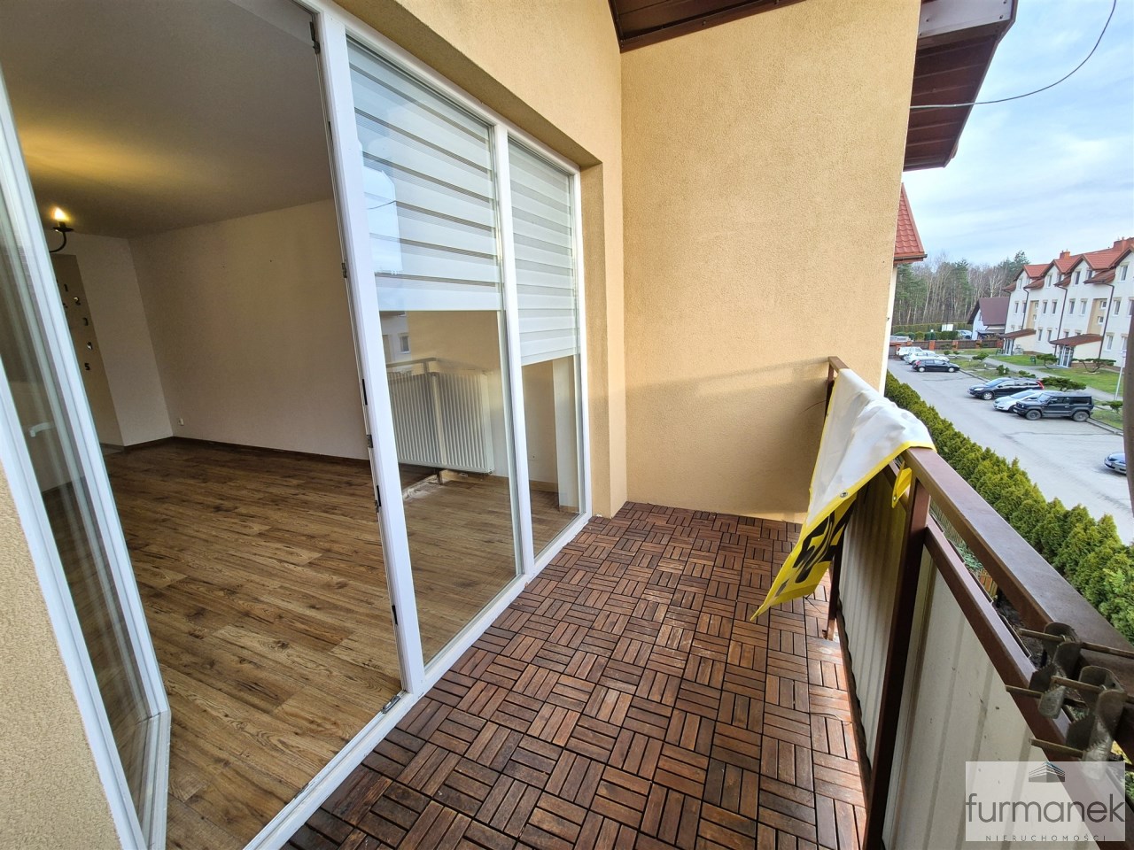 duży, zadaszony balkon wykończony płytkami tarasowymi ,