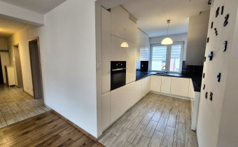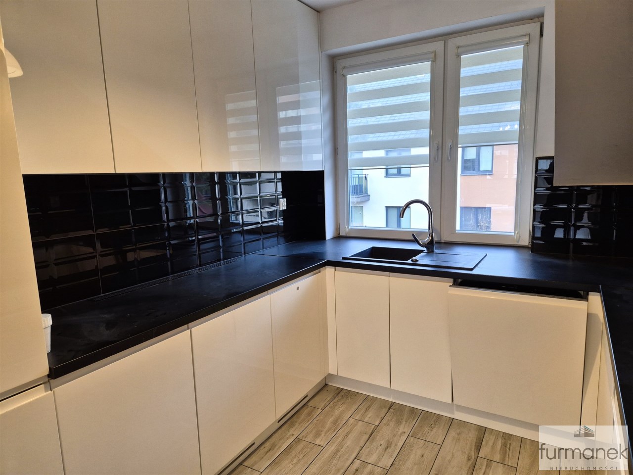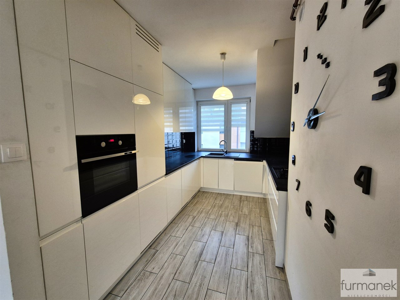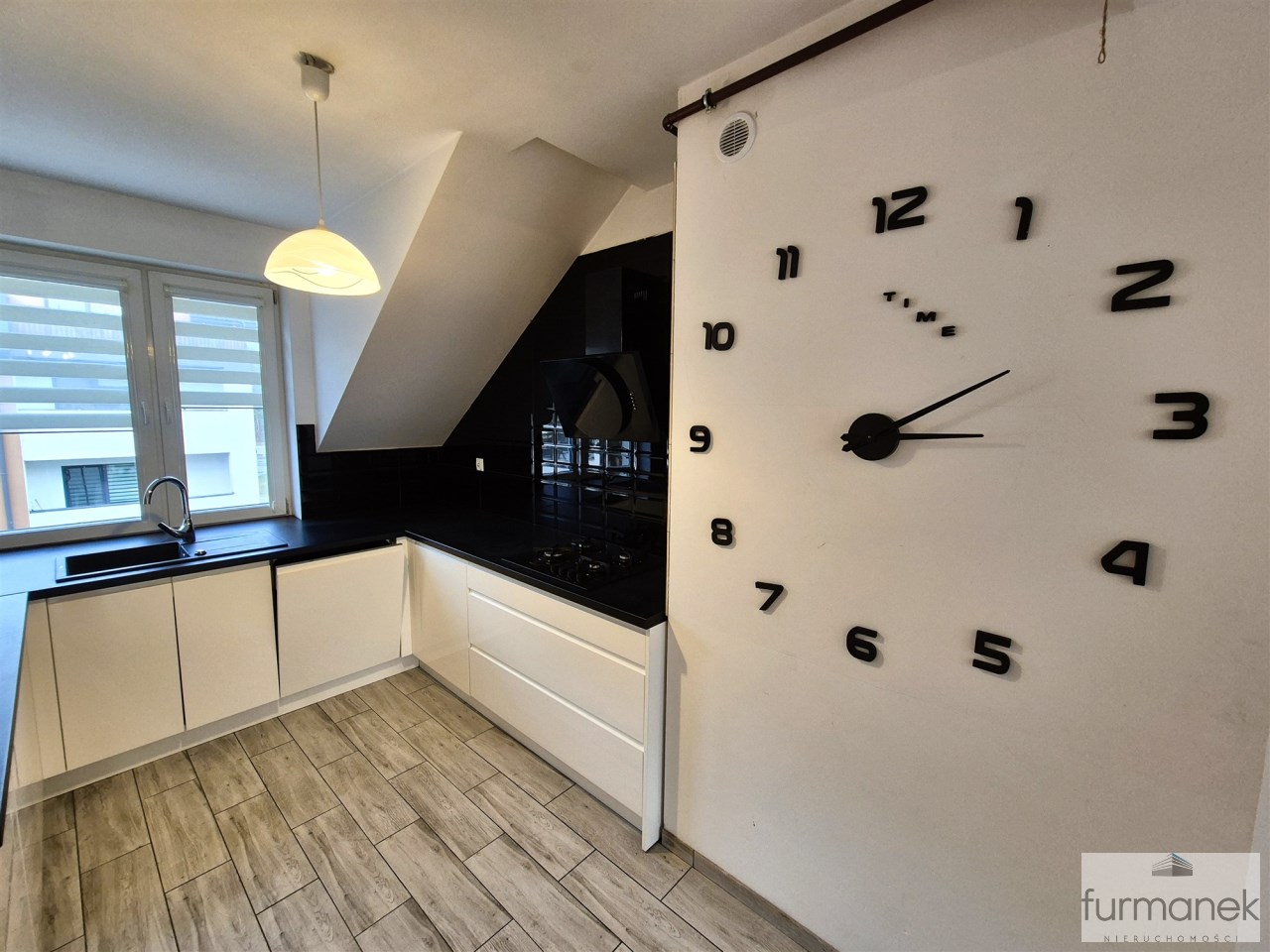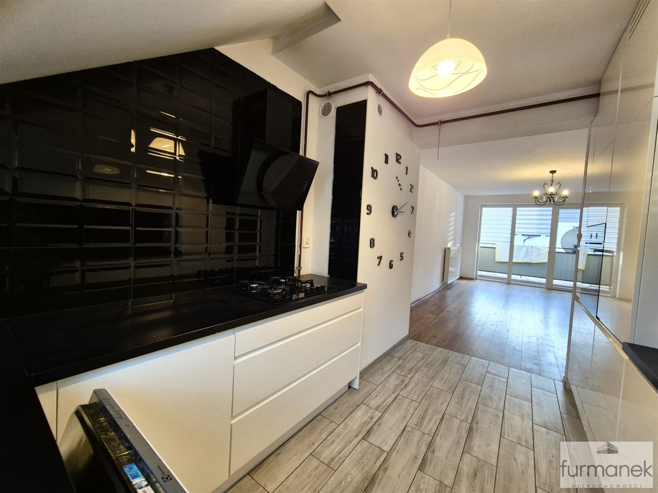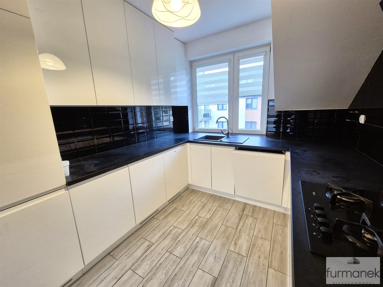 w kuchni zabudowa meblowa wraz ze sprzętem AGD: lodówka z zamrażarką, płyta gazowa, piekarnik, zmywarka, okap,