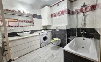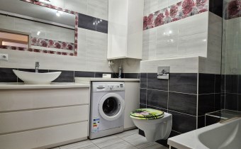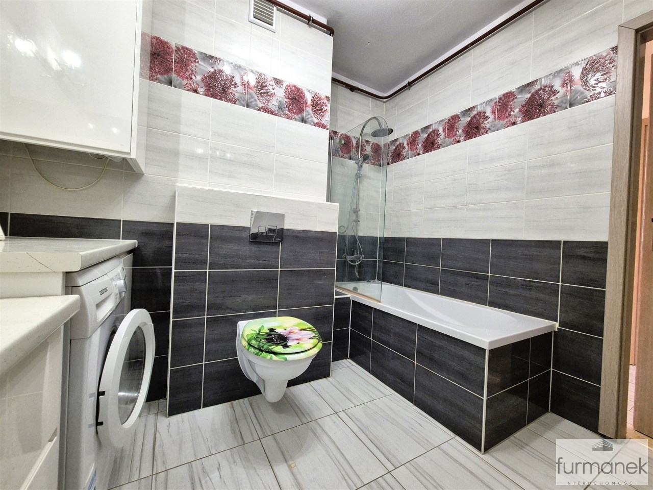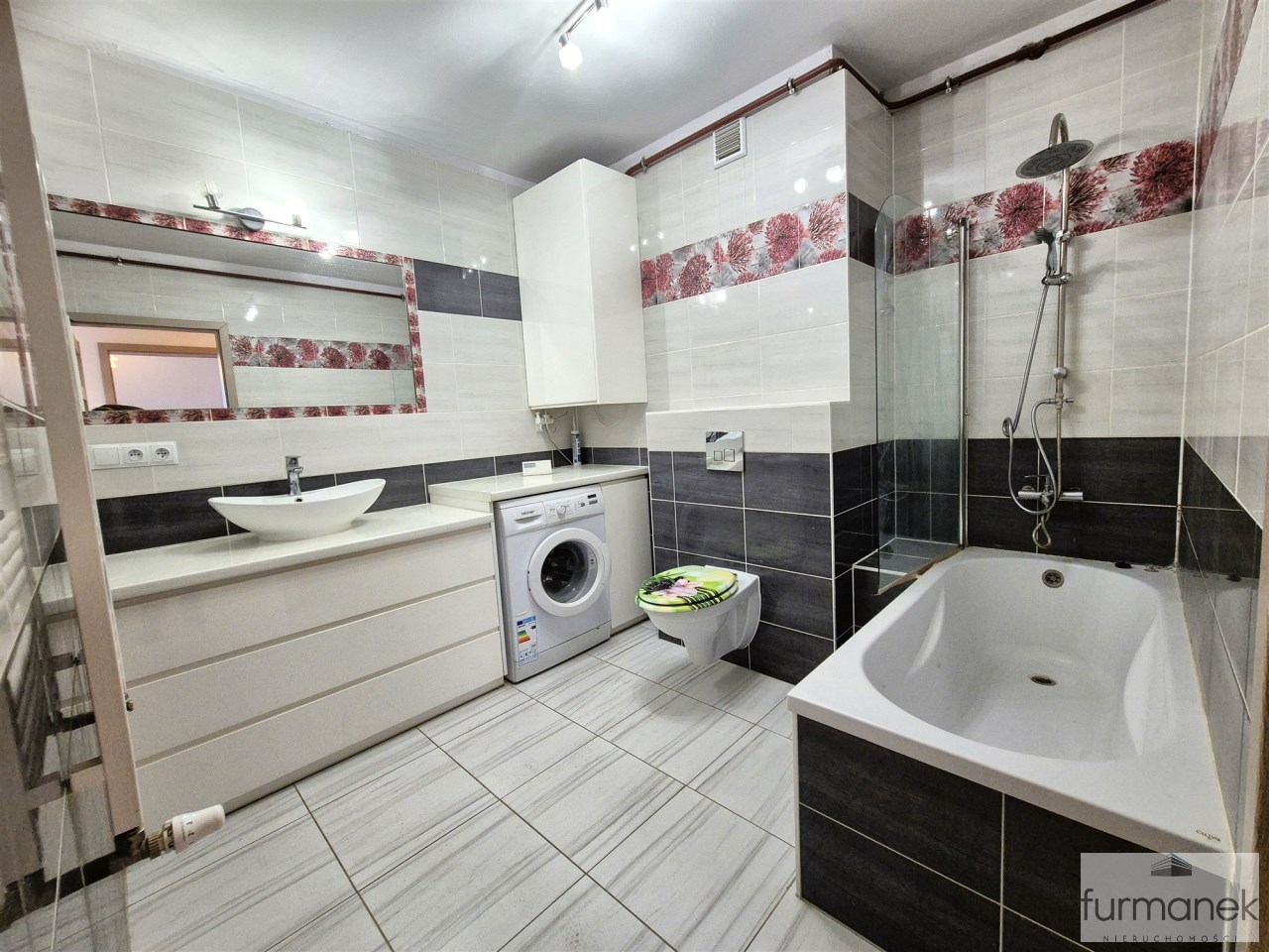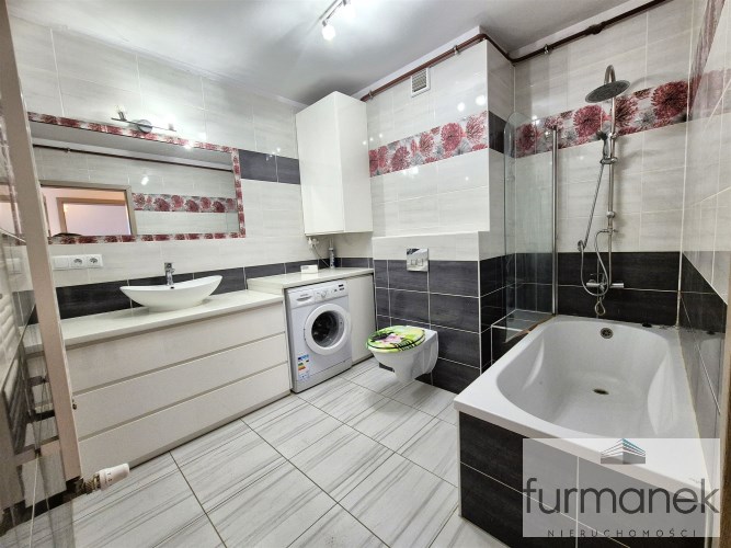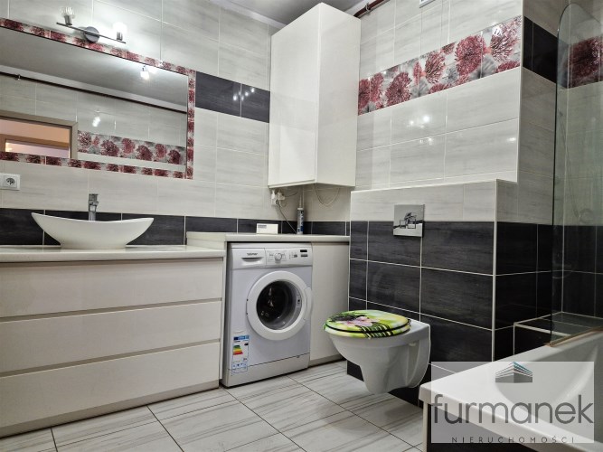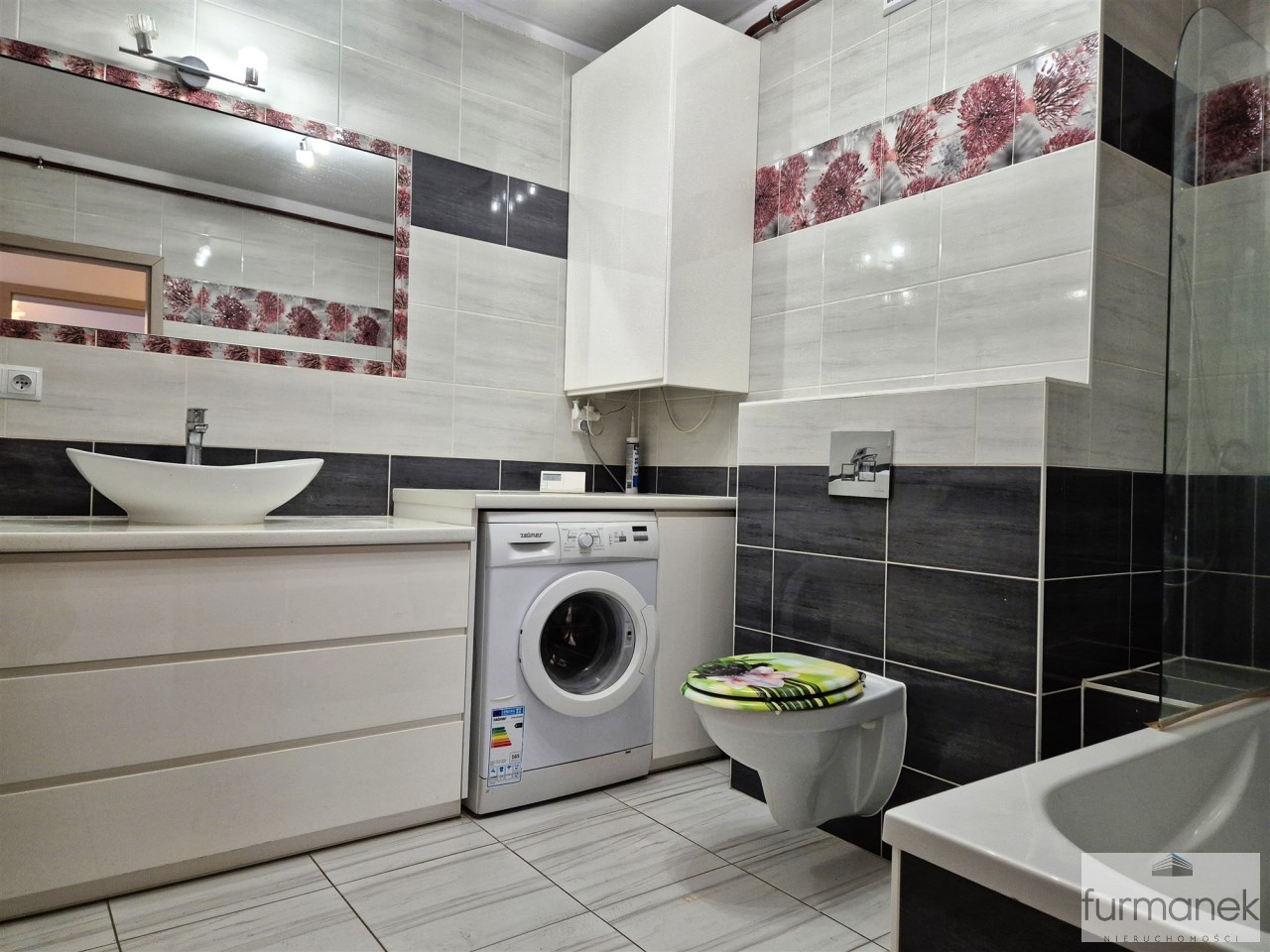 w łazience wanna, umywalka z szafką podumywalkowa, pralka, lustro oraz toaleta,